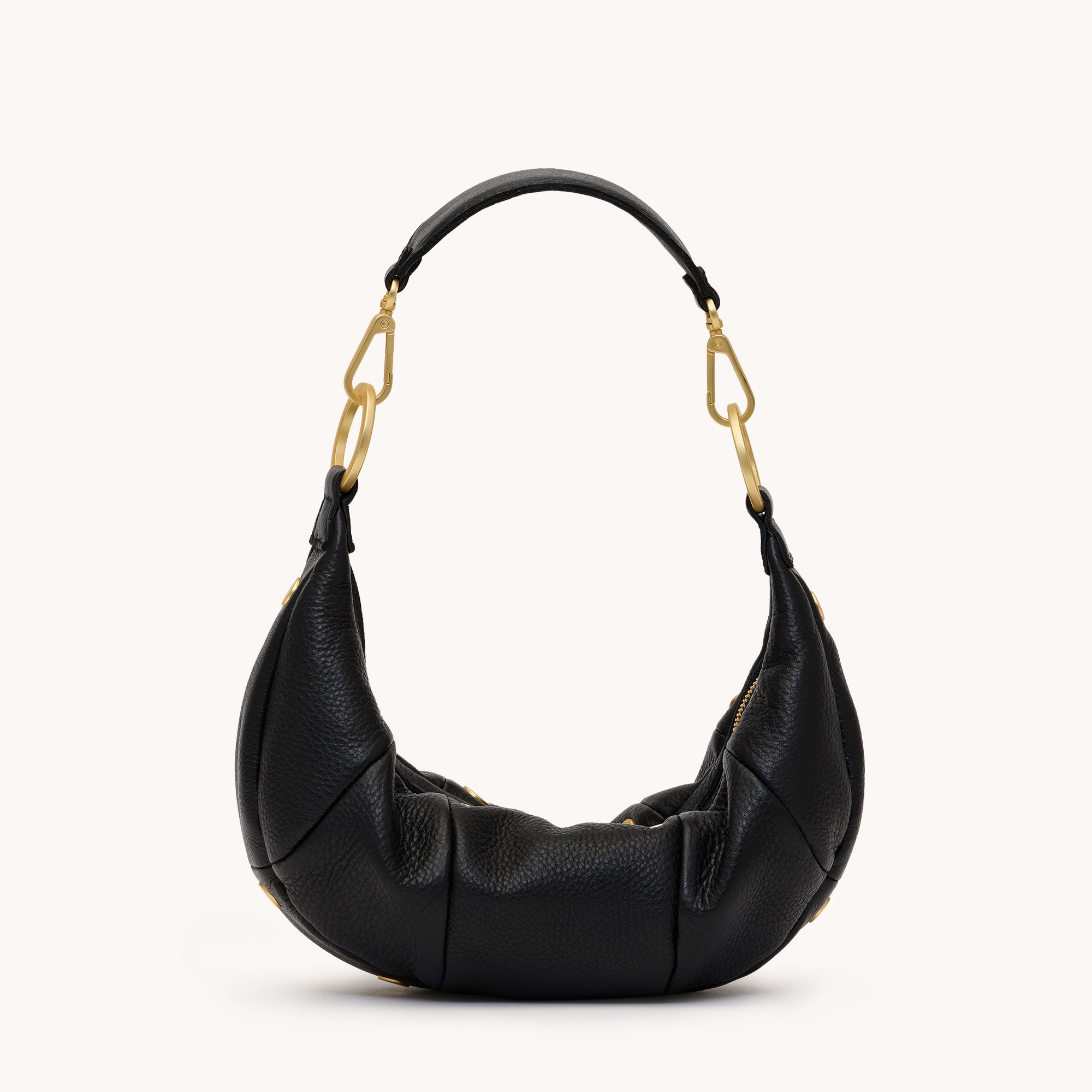 Introducing the Erica Small, the perfect day-to-night croissant-style bag. Debuting our new chunky short strap, this bag can be worn as a shoulder bag or crossbody. With special leather paneling details adorned with our iconic riveted hardware, which adds a playful element to the bag, Erica is soon to be your new everyday favorite Crafted with our classic pebbled leather Brushed gold hardware Red twill lining