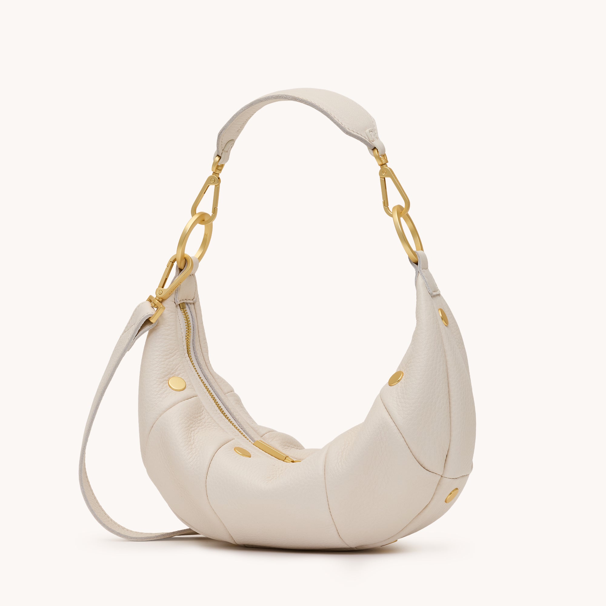 Introducing the Erica Small, the perfect day-to-night croissant-style bag. Debuting our new chunky short strap, this bag can be worn as a shoulder bag or crossbody. With special leather paneling details adorned with our iconic riveted hardware, which adds a playful element to the bag, Erica is soon to be your new everyday favorite Crafted with our classic pebbled leather Brushed gold hardware Red twill lining