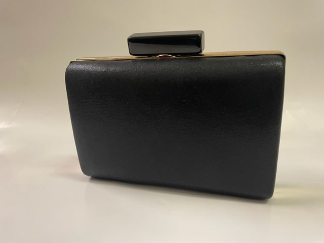 Black satin evening bag with metal handle and chain strap