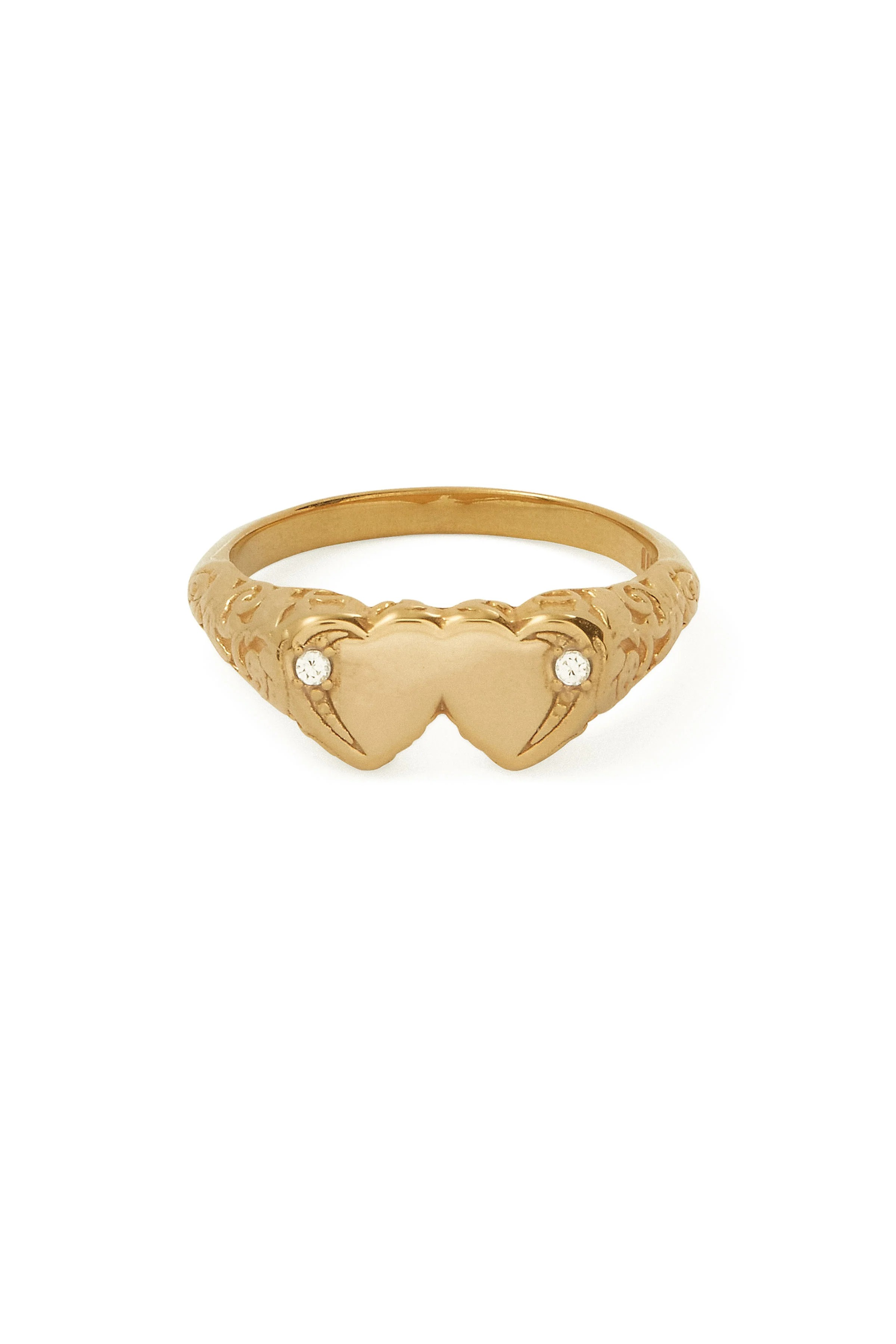 It's the OG Double Heart Ring, but with a twist. Decked out with side engravings and a little extra bling, its a modern take on the tradition of vintage signet rings.